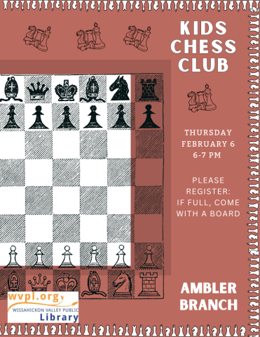 The Kids Chess Club is run by Ambler’s Youth Services Librarian who was on her college chess team. It provides kids an opportunity to play chess matches with each other. It is recommended that you know how the pieces all move and are ready to play a full game or two.